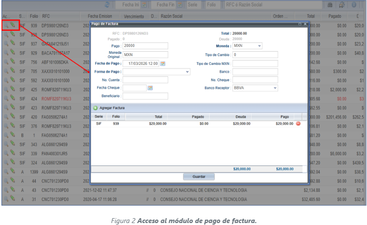 - Pago (esta información no se puede editar, en caso de estar mal, es necesario eliminar el pago)