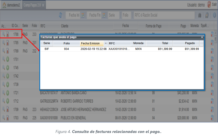 En caso de haber relacionado un pago con varias facturas, podrá ver el detalle de las facturas que cubre el pago dando clic en el icono de la lupa