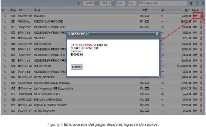 El sistema le permite borrar el registro de un pago, para realizar el borrado, dé un clic sobre el botón de la equis en color rojo que se muestra del lado derecho del registro de pago, posteriormente se mostrara una ventana notificándole que eliminara el pago de su cliente, seleccione el botón