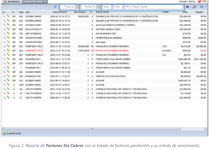 📌 Nota importante: En el reporte generado, algunos registros aparecerán en color rojo. Esto significa que la fecha de pago ya venció. En la columna “Días”, los números negativos representan los días excedentes después de la fecha límite de vencimiento. | |||
