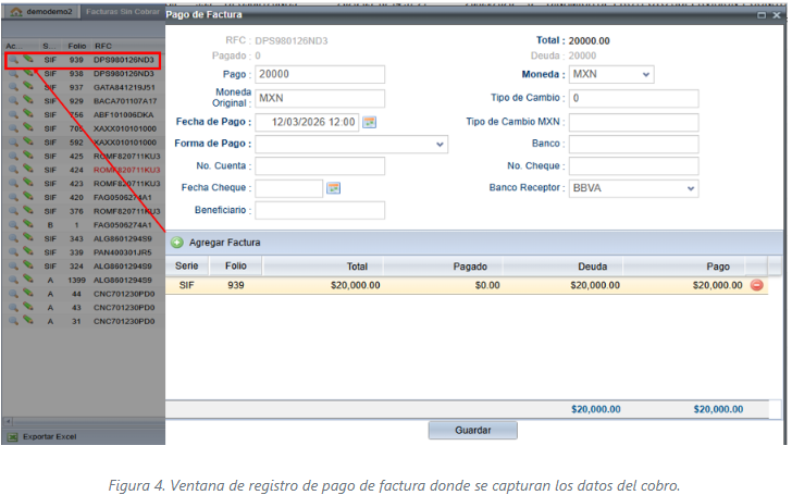 , este tiene la función de mostrar la(s) factura(s) relacionada(s) con el cobro, ya que un cobro puede estar relacionado con 1 o muchas facturas, como se muestra a continuación. Esta acción se explica en Agregar un cobro con varias Facturas