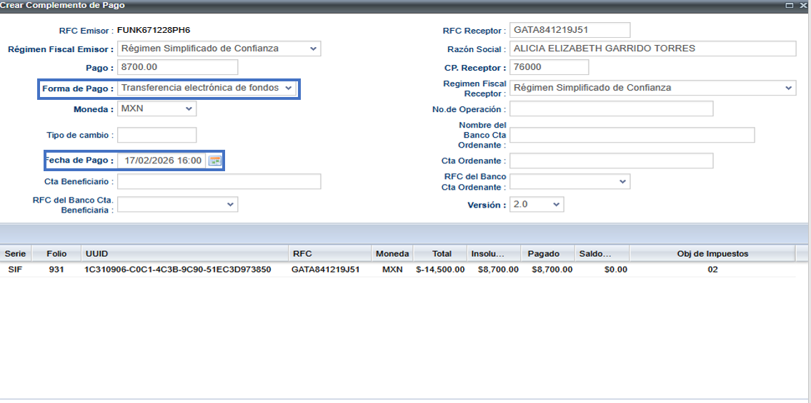 - Se abrirá la ventana de Pago de Factura, donde podrás capturar los siguientes campos: