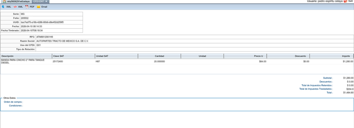 Para visualizar los conceptos de la factura, de clic sobre el botón Lupa que se muestra del lado izquierdo de cada registro de factura, se abrira una nueva pestaña dentro del sistema donde se ve a detalle los datos de la factura.