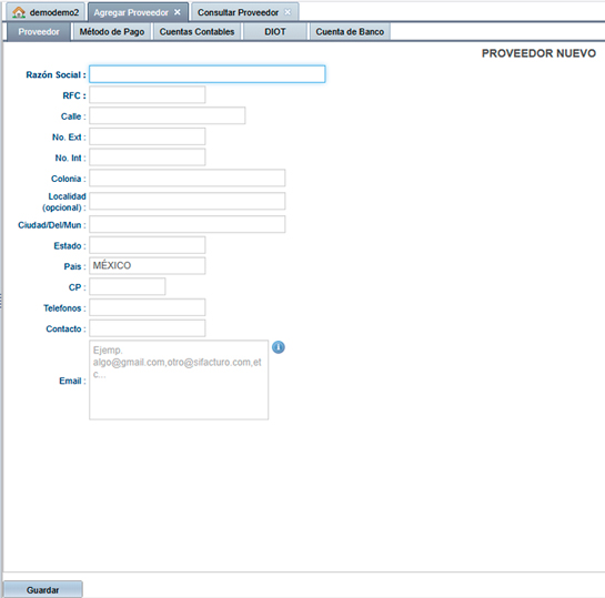 Figura 1.Pantalla para agregar un nuevo proveedor en la pestaña Proveedor.