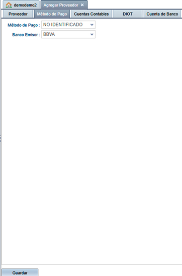 En la misma ventana encontrará la pestaña con el nombre Método de pago, donde podrá registrar el correspondiente a su proveedor, el número de cuenta y el banco de donde se le paga a su proveedor. También podrá ver una pestaña con el nombre Cuenta de Banco, en el cual podrá agregar varias cuentas de banco.